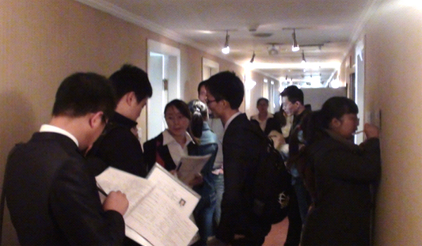 門外等候的學生還不忘關心其他的同學面試情況,一起面試的幾個好朋友在討論自己的面試情況,并根據面試情況跟同學分享自己的經驗。 |