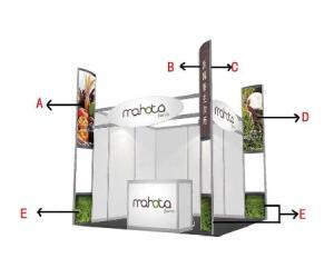 9㎡展雙開口展位,三個加高板,展位高度2.5米,楣板制作,一張洽談桌,兩把椅子,220v電源插座一個,日光燈2支,地毯,清潔服務。