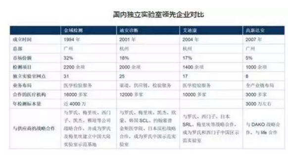 現在國內市場上金域檢驗、達安基因、迪安診斷、艾迪康四家公司已經占據了70%以上的份額,其中金域檢驗是中國目前最大的臨床檢驗服務公司,以普檢為主總計2200多種項目;達安基因主營業務是基因檢測試劑的研發生產銷售,大概1000余項檢測項目,目前在廣州、上海、合肥、成都等地都有實驗室;迪安診斷總部在杭州,現在大概2000余項醫學診斷項目,在環渤海灣、長三角、珠三角領域有優勢;艾迪康現在可以提供1400余項檢測項目,為全國10000多家醫療機構提供服務。此外,還有康圣環球醫學特檢集團(北京海思特臨床檢驗所、武漢康圣達醫學檢驗所、上海新培晶醫學檢驗所)是目前國內最大的特種臨床檢驗服務公司。
