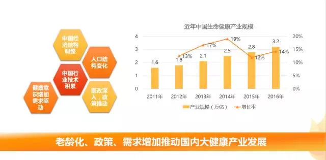 人口老齡化、政策驅(qū)動(dòng)、行業(yè)技術(shù)積累以及人們追求健康的需求推動(dòng)我國(guó)大健康產(chǎn)業(yè)發(fā)展。據(jù)火石創(chuàng)造的報(bào)告數(shù)據(jù)顯示,2012年我國(guó)生命大健康產(chǎn)業(yè)的規(guī)模為1.8萬(wàn)億元人民幣,到2016年已經(jīng)達(dá)到3.2萬(wàn)億元人民幣。
