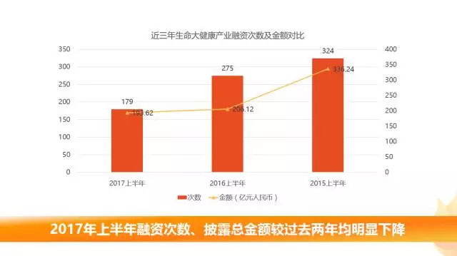 相比2016年H1的275筆融資,合計(jì)206.12億元人民幣和2015年H1的324筆、336.24億元人民幣,2017年生命大健康產(chǎn)業(yè)H1融資次數(shù)、披露金額較過(guò)去兩年均明顯下降。