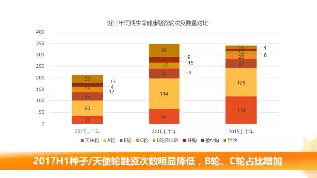 對(duì)比近三年H1生命健康產(chǎn)業(yè)融資階段,最明顯的特征就是2017年H1種子/天使輪的融資次數(shù)明顯降低,B輪和C輪的占比大大增加。可見(jiàn)大量項(xiàng)目在2017年已經(jīng)進(jìn)入穩(wěn)定成長(zhǎng)期。