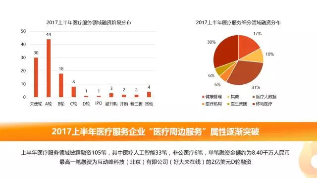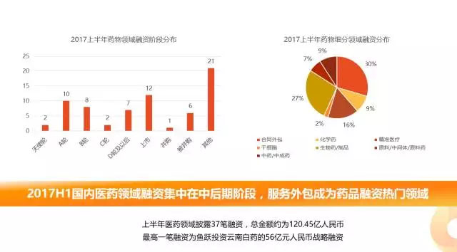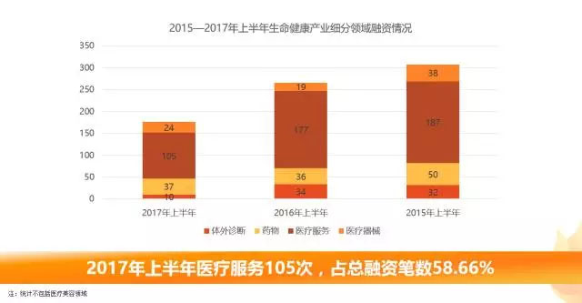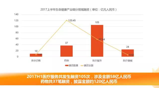 從產(chǎn)業(yè)細(xì)分領(lǐng)域融資情況來(lái)看,2017上半年醫(yī)療服務(wù)行業(yè)共發(fā)生融資105次,涉及金額約57.94億元人民幣。醫(yī)藥行業(yè)共發(fā)生37筆融資,明確披露融資金額約為120.45億元人民幣。