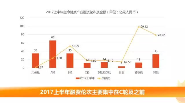 從產(chǎn)業(yè)融資階段來(lái)看,2017上半年生命大健康產(chǎn)業(yè)的融資階段主要集中在C輪及之前。其中A輪階段發(fā)生66起融資,明確披露融資金額約為23.8億元人民幣;天使輪和B輪都披露了35筆,明確披露金額分別約為1.67億元人民幣和52.99億元人民幣。其中有13家企業(yè)被并購(gòu),涉及金額達(dá)99.12億元人民。