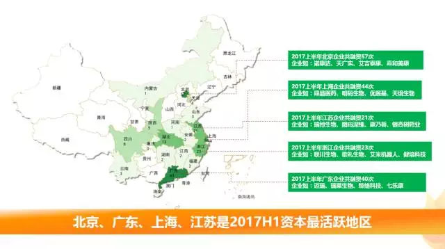 從產(chǎn)業(yè)融資的地域分布情況來(lái)看,北京、廣東、上海、浙江、江蘇是2017上半年生命大健康產(chǎn)業(yè)資本最活躍的地區(qū)。其中首都北京是融資發(fā)生最多的地方,共公開(kāi)披露融資57次,涉及融資的企業(yè)如諾康達(dá)、天廣實(shí)、艾吉泰康等等;位于上海的企業(yè)共發(fā)生融資44次,相關(guān)企業(yè)主要有明碼生物、鼎晶醫(yī)藥、天境生物等;廣東披露的融資數(shù)量?jī)H次于上海,明確披露了40起,涉及融資的企業(yè)如:衛(wèi)光生物、瑞萊生物、臻絡(luò)科技等。此外,浙江和江蘇分別披露融資數(shù)量為23筆和21筆。