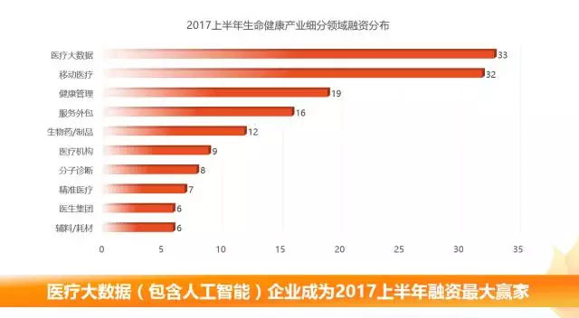 其中,醫(yī)療大數(shù)據(jù)、移動(dòng)醫(yī)療、健康管理、合同外包組織、生物藥/制品是獲得融資數(shù)量排名前5的細(xì)分領(lǐng)域,其中醫(yī)療大數(shù)據(jù)(包含人工智能)的企業(yè)成為2017上半年生命健康產(chǎn)業(yè)融資的最大贏家,共有33家企業(yè)完成融資。