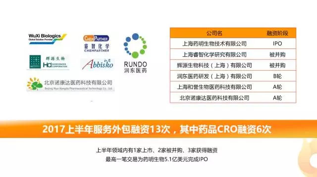 從醫(yī)藥行業(yè)細(xì)分領(lǐng)域來(lái)看,醫(yī)藥外包組織行業(yè)由于行業(yè)政策、新藥市場(chǎng)等因素的推動(dòng)成為熱門關(guān)注領(lǐng)域。2017上半年,醫(yī)藥研發(fā)外包組織(CRO)披露融資6次,其中1家企業(yè)上市、2家企業(yè)被巨額并購(gòu)、3家企業(yè)完成融資。