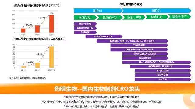 生物制劑在全球藥物市場(chǎng)中占據(jù)重要地位,目前市場(chǎng)規(guī)模保持較快增長(zhǎng),與之對(duì)應(yīng)的生物制劑研發(fā)服務(wù)市場(chǎng)亦潛力巨大,預(yù)計(jì)國(guó)內(nèi)市場(chǎng)規(guī)模將由2016年的21億元增長(zhǎng)到2021年的92億元。藥明生物于5月29日宣布將正式登陸港股市場(chǎng)。作為國(guó)內(nèi)生物制劑CRO龍頭企業(yè),藥明生物占據(jù)全球約1.8%的市場(chǎng)份額,占據(jù)國(guó)內(nèi)約48%的市場(chǎng)份額。