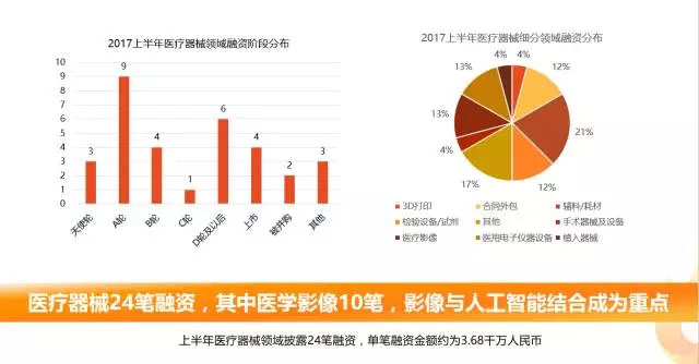 2017年H1醫(yī)療器械領(lǐng)域共披露融資24筆,明確披露融資金額約3.68千萬(wàn)元人民幣。其中醫(yī)學(xué)影像領(lǐng)域共披露10筆融資。