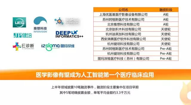 醫(yī)學(xué)影像與人工智能結(jié)合成為熱門關(guān)注領(lǐng)域,且有望成為人工智能領(lǐng)域第一個(gè)醫(yī)療臨床應(yīng)用,融資階段主要集中在項(xiàng)目早期,其中5筆明確披露融資金額,單筆平均金額約為3.3千萬(wàn)元人民幣。