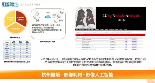 杭州健培科技有限公司致力于醫(yī)學(xué)影像大數(shù)據(jù)分析技術(shù)(MIBA)的研發(fā)及應(yīng)用,現(xiàn)已形成醫(yī)學(xué)影像輸出、智慧醫(yī)療和智能診斷為主,其他大數(shù)據(jù)支撐設(shè)備及平臺(tái)建設(shè)為輔的“智慧衛(wèi)生”生態(tài)系統(tǒng)。2017年7月21日,旗下閱片機(jī)器人再次以91.6%的假陽(yáng)性率創(chuàng)在了新的世界記錄,最新成果已經(jīng)集成到健培HealthView診斷云用于臨床使用。