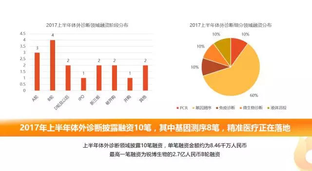 2017年H1國(guó)內(nèi)體外診斷領(lǐng)域披露融資10筆,單筆融資金額約為8.46千萬(wàn)元人民幣,最高一筆融資為銳博生物的2.7億元人民幣B輪融資。