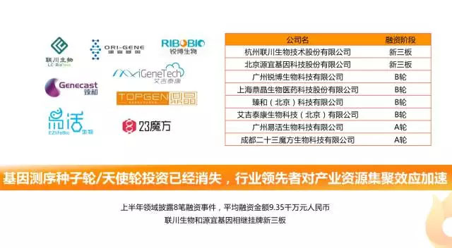 其中基因測(cè)序領(lǐng)域披露8筆融資,平均融資金額約為9.35千萬(wàn)元人民幣,種子輪/天使輪融資占比減少,融資階段主要集中在B輪,聯(lián)川生物和源宜基因相繼掛牌新三板,可見(jiàn)行業(yè)領(lǐng)先者對(duì)產(chǎn)業(yè)資源集聚效應(yīng)加速,精準(zhǔn)醫(yī)療正在加速落地。