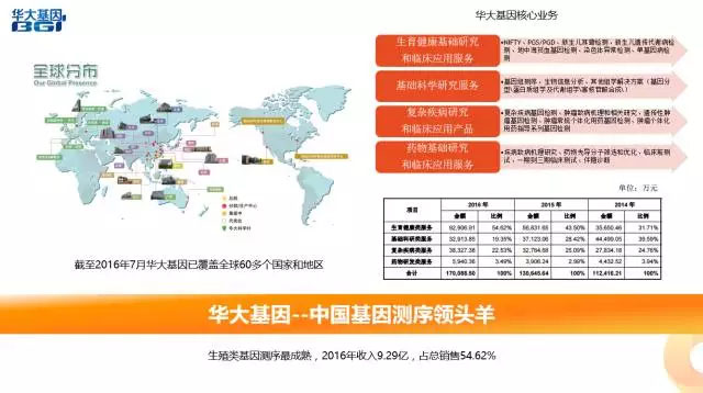 2017年7月14日,中國(guó)基因測(cè)序領(lǐng)頭羊——華大基因正式登陸深交所創(chuàng)業(yè)板,成為真正意義的基因測(cè)序行業(yè)登陸資本市場(chǎng)的第一股。其核心業(yè)務(wù)涉及生育健康基礎(chǔ)研究和臨床應(yīng)用服務(wù)、基礎(chǔ)科學(xué)研究服務(wù)、復(fù)雜疾病研究和臨床應(yīng)用產(chǎn)品、以及藥物基礎(chǔ)研究和臨床應(yīng)用服務(wù)。其中生殖類基因測(cè)序應(yīng)用的最為成熟,2016年收入為9.29億,占總銷售額的54.62%。