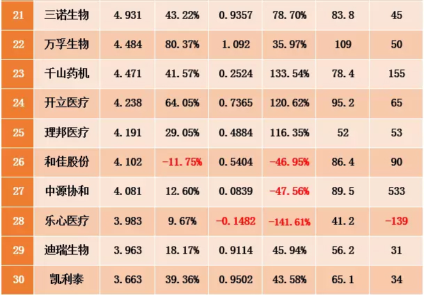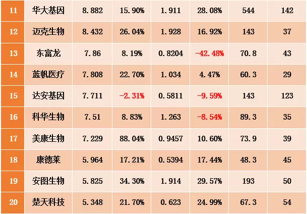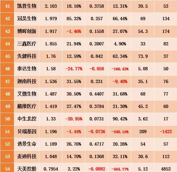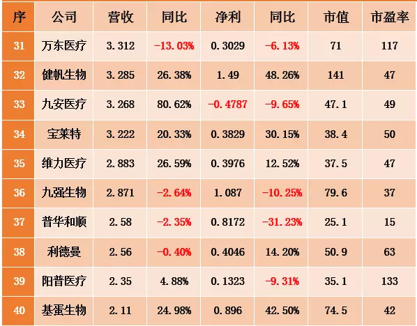 08.市盈率排行前十位依次為:天美控股、中源協(xié)和、博暉創(chuàng)新、千山藥機、華大基因、冠昊生物、陽普醫(yī)療、達安基因、萬東醫(yī)療、麥迪科技。其中,市盈率最高的天美控股達到了4852,營收方面,有7家企業(yè)實現(xiàn)同比正增長,3家同比負增長。