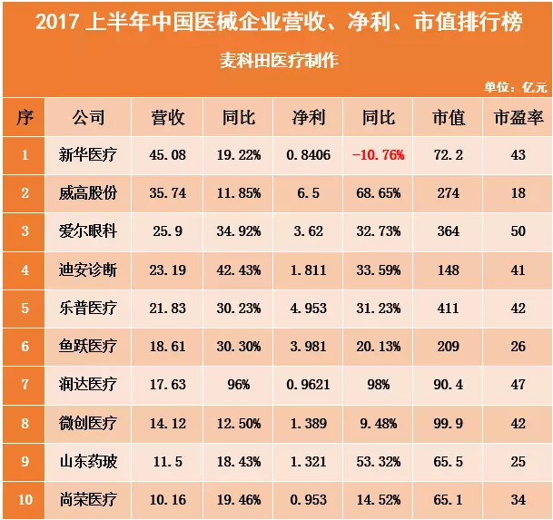 2017年上半年多數(shù)醫(yī)械上市企業(yè)表現(xiàn)良好,上榜的54家企業(yè)有44家實現(xiàn)營收同期增長,凈利潤僅5家為虧損狀態(tài)。新華醫(yī)療以營收45.08億元位居營收榜第一,威高股份以凈利潤6.5億元奪得凈利榜頭把交椅,今年剛剛上市的華大基因以市值544億元擊敗樂普醫(yī)療,成為中國醫(yī)械企業(yè)市值第一。