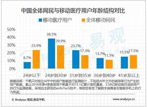 目前,移動醫療的用戶群體年齡整體偏大,大多集中于24歲-40歲這個年齡段,這與年輕用戶醫療健康需求和意識不強有關。