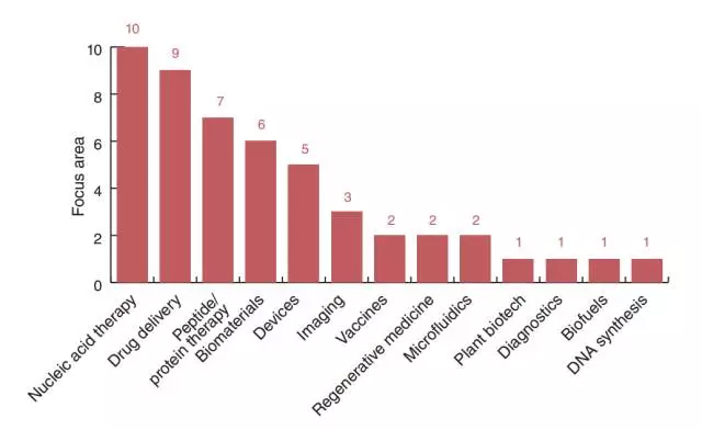 核苷酸療法和藥物遞送是最受關注的兩個領域(圖片來源:《Nature Biotechnology》)