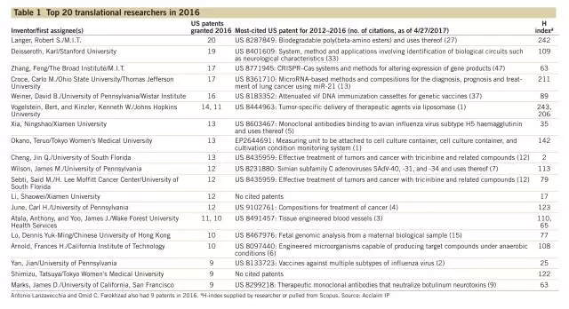 本榜單統計了科研人員們在2016年里獲批的美國專利數,同時也考量了他們過去5年被引用最多的專利、以及H index。Robert Langer教授、James Wilson教授、Carl June教授等知名科學家上榜。從被引用最多的專利來看,核酸療法和藥物遞送是最受關注的領域。