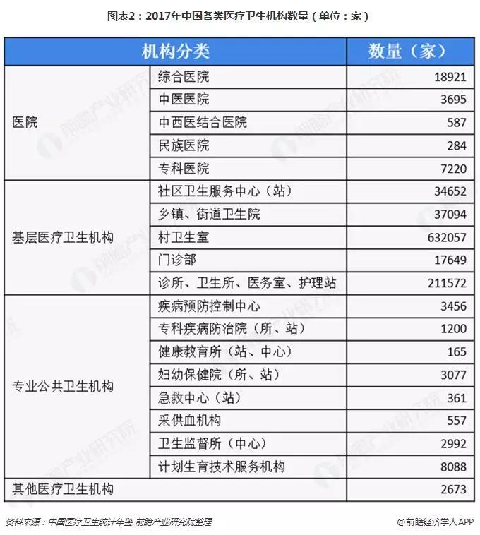2017年,中國(guó)各類醫(yī)療衛(wèi)生機(jī)構(gòu)數(shù)量為98.66萬(wàn)家,其中醫(yī)院數(shù)量為31056家,基層醫(yī)療衛(wèi)生機(jī)構(gòu)為933024家,專業(yè)公共衛(wèi)生機(jī)構(gòu)為19896家,其他醫(yī)療衛(wèi)生機(jī)構(gòu)為2673家;基層醫(yī)療衛(wèi)生機(jī)構(gòu)是醫(yī)院數(shù)量的30多倍。