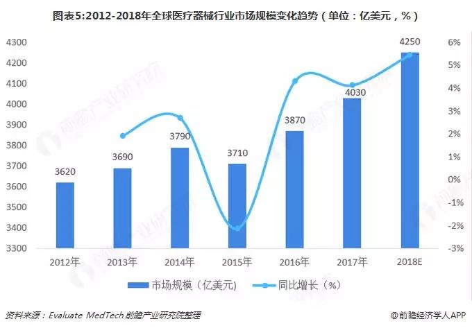 隨著全球人口自然增長(zhǎng),人口老齡化程度提高,以及發(fā)展中國(guó)家經(jīng)濟(jì)增長(zhǎng),全球范圍內(nèi)醫(yī)療器械市場(chǎng)持續(xù)增長(zhǎng)。根據(jù) Evaluate MedTech 統(tǒng)計(jì),2017 年全球醫(yī)療器械銷售規(guī)模為4030億美元,是全球處方藥市場(chǎng)規(guī)模的一半,預(yù)計(jì) 2018年將達(dá)到4550億美元。行業(yè)增速方面,可以看出近年來(lái),器械市場(chǎng)的增速波動(dòng)較大且預(yù)計(jì)這種趨勢(shì)還將持續(xù),期間年均復(fù)合增長(zhǎng)率將保持在4.5%左右。