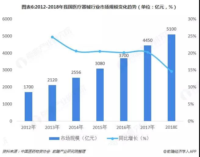 隨著我國(guó)經(jīng)濟(jì)的不斷發(fā)展以及生活水平的不斷提高,人們對(duì)醫(yī)療保健的意識(shí)逐漸增強(qiáng),因此對(duì)于醫(yī)療器械產(chǎn)品的需求也在不斷地攀升,再加上我國(guó)正逐步進(jìn)入老齡化社會(huì)和政策對(duì)于醫(yī)療器械這個(gè)行業(yè)的支持,使得我國(guó)醫(yī)療器械市場(chǎng)規(guī)模從2012年1700億元快速增長(zhǎng)到2017年的4450億元,預(yù)計(jì)到2018年我國(guó)醫(yī)療器械行業(yè)市場(chǎng)規(guī)模將達(dá)到5100億元。對(duì)比國(guó)際市場(chǎng),顯然我國(guó)醫(yī)療器械市場(chǎng)還有巨大成長(zhǎng)空間。