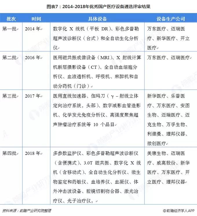 2012 年,我國(guó)出臺(tái)《醫(yī)療器械科技產(chǎn)業(yè)“十二五”專項(xiàng)規(guī)劃》重點(diǎn)開發(fā)一批國(guó)產(chǎn)高端醫(yī)療器械,形成進(jìn)口替代,自此拉開我國(guó)醫(yī)療器械國(guó)產(chǎn)化的序幕。2015年國(guó)務(wù)院出臺(tái)的《全國(guó)醫(yī)療衛(wèi)生服務(wù)體系規(guī)劃綱要(2015-2020年)》,明確提出要降低醫(yī)療成本,逐步提高國(guó)產(chǎn)醫(yī)用設(shè)備配置水平。2014年5月,國(guó)家衛(wèi)生計(jì)生委啟動(dòng)第一批優(yōu)秀國(guó)產(chǎn)醫(yī)療設(shè)備產(chǎn)品遴選工作。首批優(yōu)秀國(guó)產(chǎn)醫(yī)療設(shè)備主要遴選了數(shù)字化X線機(jī)、彩色多普勒超聲波診斷儀和全自動(dòng)生化分析儀3個(gè)品目。截至2018年底,已經(jīng)開展了四批。