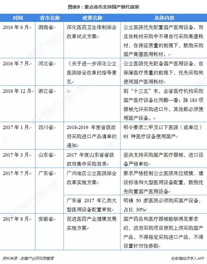 除國(guó)家政策層面,2017 年起,政府將浙江、四川、廣東、上海、江蘇 5 省市列入扶持國(guó)產(chǎn)醫(yī)療設(shè)備首批試點(diǎn)推廣,可見國(guó)家扶持政策逐步落地,進(jìn)口替代進(jìn)程有望加快。