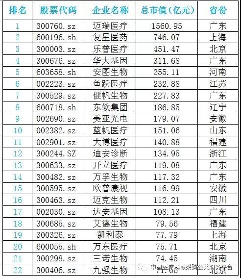 中國醫療器械行業上市公司總市值排名前十的企業有:邁瑞醫療、復星醫藥、樂普醫療、華大基因、安圖生物、魚躍醫療、健帆生物、東軟集團、美亞光電、藍帆醫療。