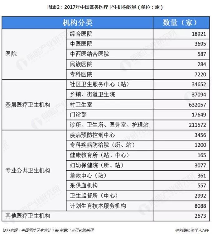2017年,中國各類醫療衛生機構數量為98.66萬家,其中醫院數量為31056家,基層醫療衛生機構為933024家,專業公共衛生機構為19896家,其他醫療衛生機構為2673家;基層醫療衛生機構是醫院數量的30多倍。