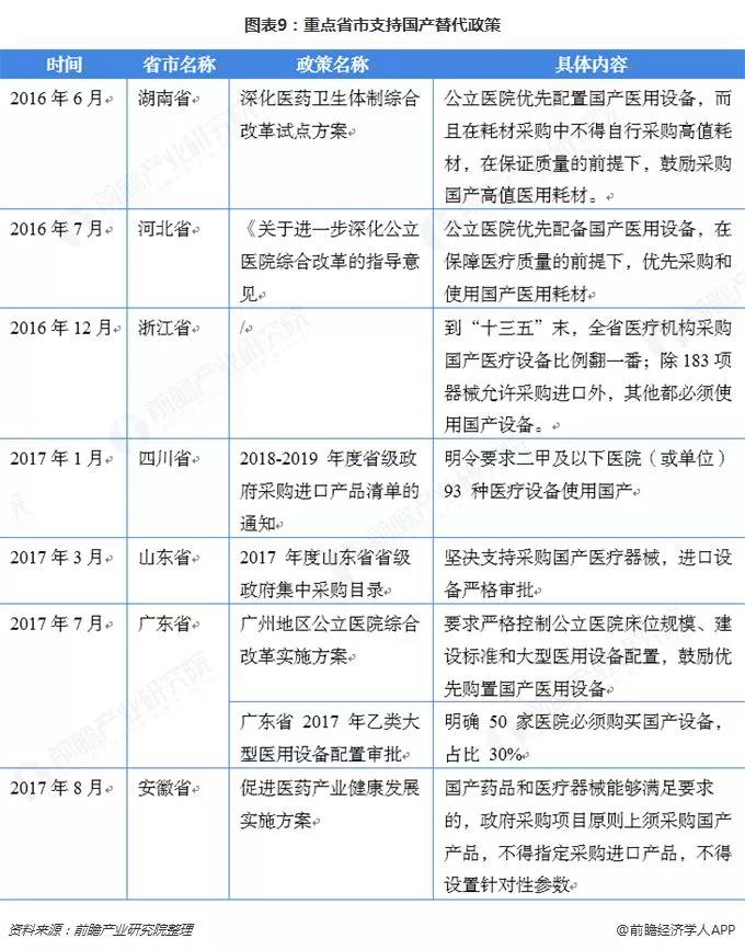 除國家政策層面,2017 年起,政府將浙江、四川、廣東、上海、江蘇 5 省市列入扶持國產醫療設備首批試點推廣,可見國家扶持政策逐步落地,進口替代進程有望加快。