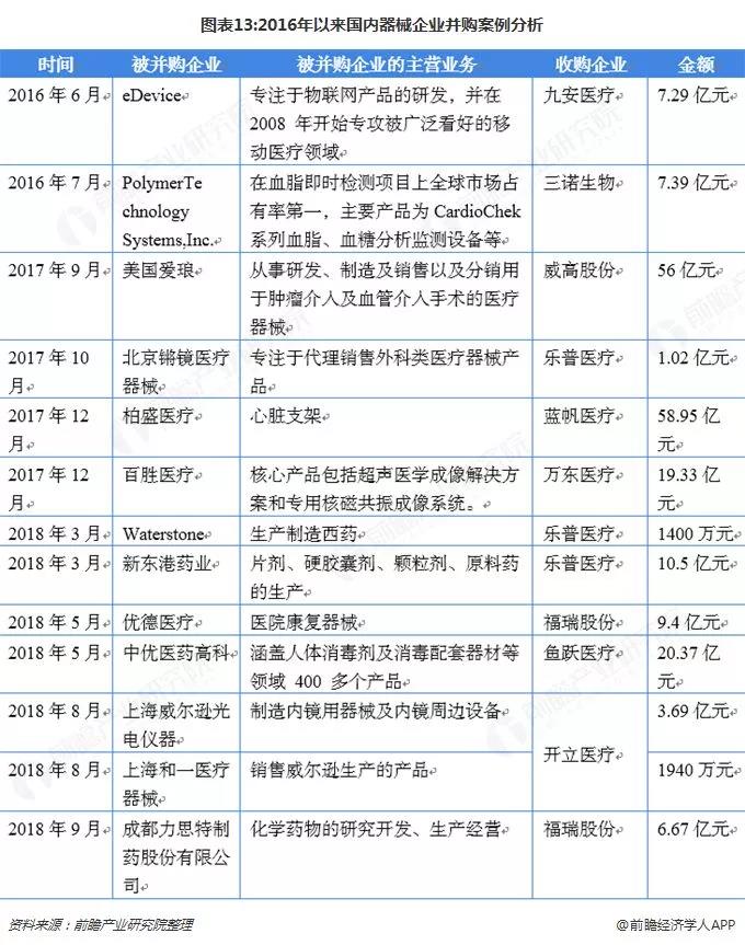 縱觀醫療器械巨頭的成長,并購起到了至關重要的作用。如行業巨頭美敦力進行了大量外延式擴張,分別通過并購樞法模?丹歷、MiniMed 以及柯惠醫療成為脊柱產品、 胰島素輸注泵技術的全球領先者以及醫療器械全球第一。國內器械企業雖然從規模、發展階段等均不及國外巨頭,但近幾年一些細分行業優秀企業也在緊跟步伐,在做大做深主業的基礎上,不斷進行外延并購,提高競爭力。