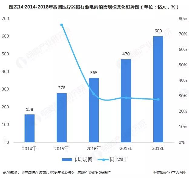 目前,除了傳統銷售模式外,醫療器械領域電子商務企業呈現出增長趨勢。2014-2017年我國醫療器械行業電商銷售規模實現快速增長,從2014年的158億增長到2017年470億。各大醫療器械流通企業普遍構建或整合集分銷、物流、電子商務集成服務模式以及數據處理的現代化智能化服務平臺,成為推動醫療器械流通增值服務的新載體。