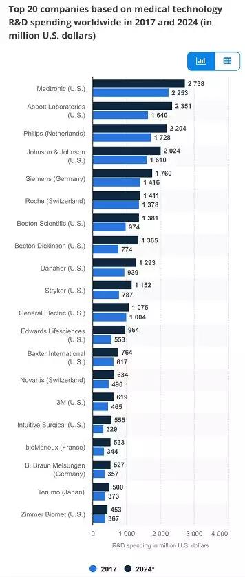 2017年和2024年全球醫療技術研發支出排名前20位的公司(以百萬美元計)