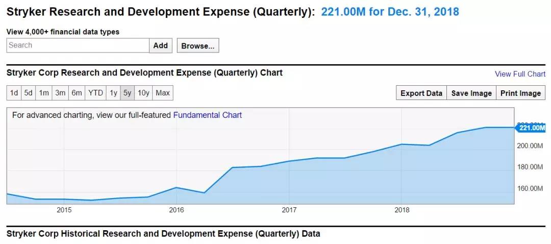 Stryker為了鞏固其骨科行業巨頭的地位,在2013年以17億美元收購了以色列外科手術機器人公司MAKO Surgical,并在2015年推出了第三代MAKO System,升級版的MAKO System是整合了Stryker提供的植入物和MAKO平臺。2016年Stryker將自己旗下的全膝關節置換術系統Triathlon Total Knee System與MAKO System 結合推出了第一代全膝關節置換平臺MAKO TKA,最近幾年推出的關節置換術還有涉及到肩關節、肘關節、踝關節、腕關節和手指關節。據Stryker 2018年報顯示,公司銷售凈收入為136.01億美元,R&D投入為從2011年的4.62億美元上升至8.62億美元,18年研發強度約為6.3%,2018年第四季度R&D投入為2.21億美元,而2015年第四季度R&D投入僅為1.53億美元[5]。