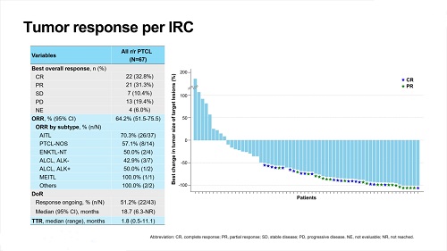 該研究旨在評估澤美妥司他片單藥在R/R PTCL患者中的抗腫瘤療效和安全性。其主要研究終點為由獨立影像評審委員會(IRC)基于Lugano 2014標準評估的客觀緩解率(ORR),次要研究終點包括無進展生存期(PFS)、緩解持續時間(DoR)、總生存期(OS)等。